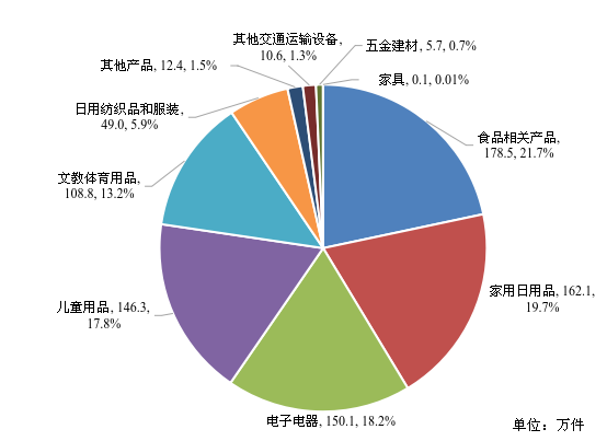 从产品类别看,召回数量较多的是食品相关产品118次,涉及产品178.5万件,占召回总数量的21.7%;家用日用品66次,涉及产品162.1万件,占召回总数量的19.7%;电子电器203次,涉及产品150.1万件,占召回总数量的18.2%;儿童用品351次,涉及产品146.3万件,占召回总数量的17.8%;文教体育用品34次,涉及产品108.8万件,占召回总数量的13.2%(见图4)。