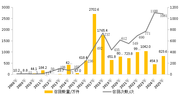图3 2008—2025年消费品召回的次数与数量